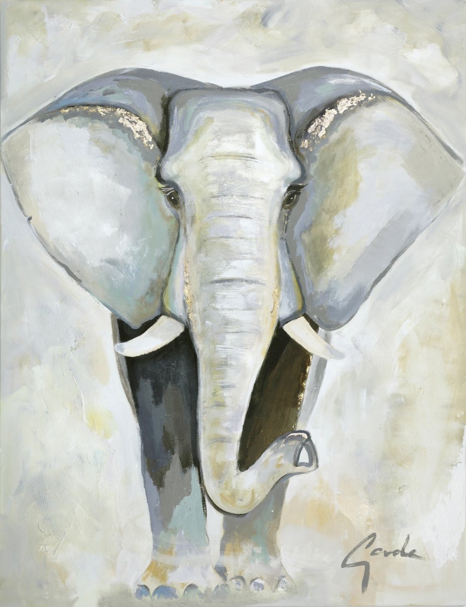 Iconic and colorful elephant painting in Gade's typical style; majestic with big eyes and beautiful harmonious colors.
