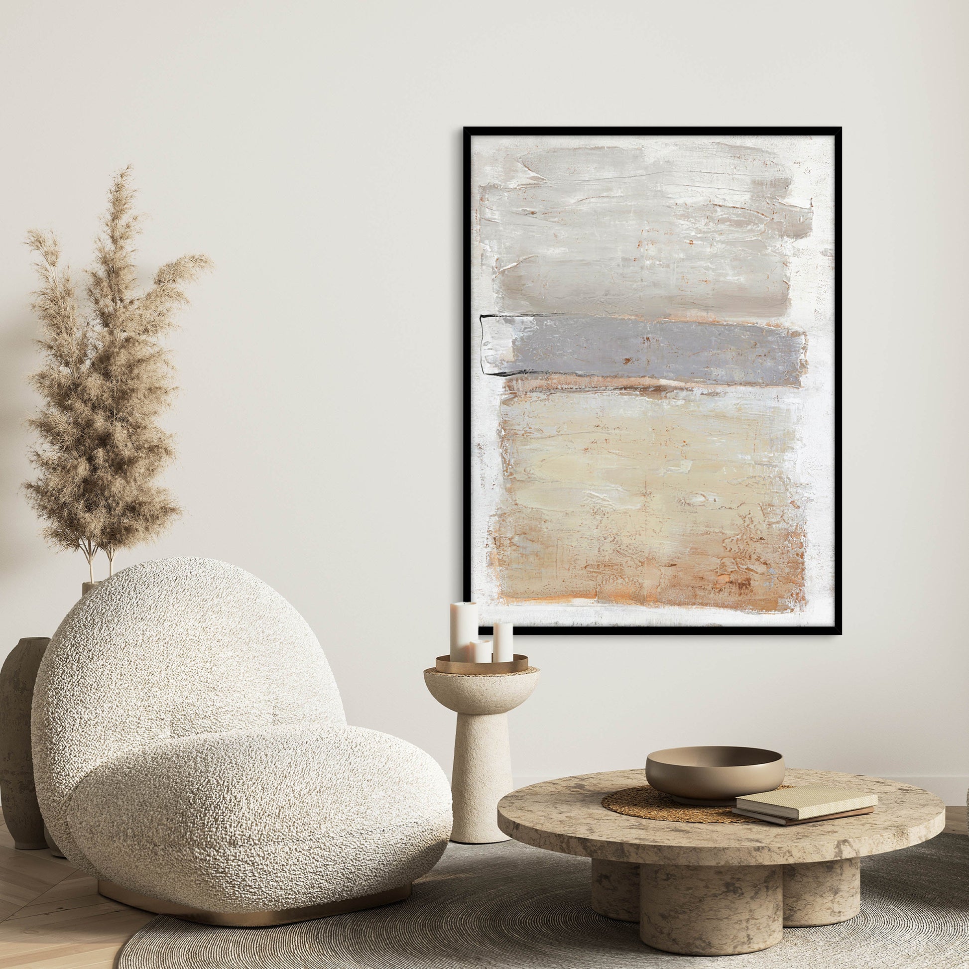 Raw structure, modern colors and simplicity are keywords for this trendy painting. Blended colors in a simple but modern composition on a tactile background make for a top-trendy painting which can easily be incorporated in any modern interior. The colors are predominantly sand, grey, and light golden colors. If you are looking to achieve a peaceful and harmonious look on your walls, this painting will be a perfect match.