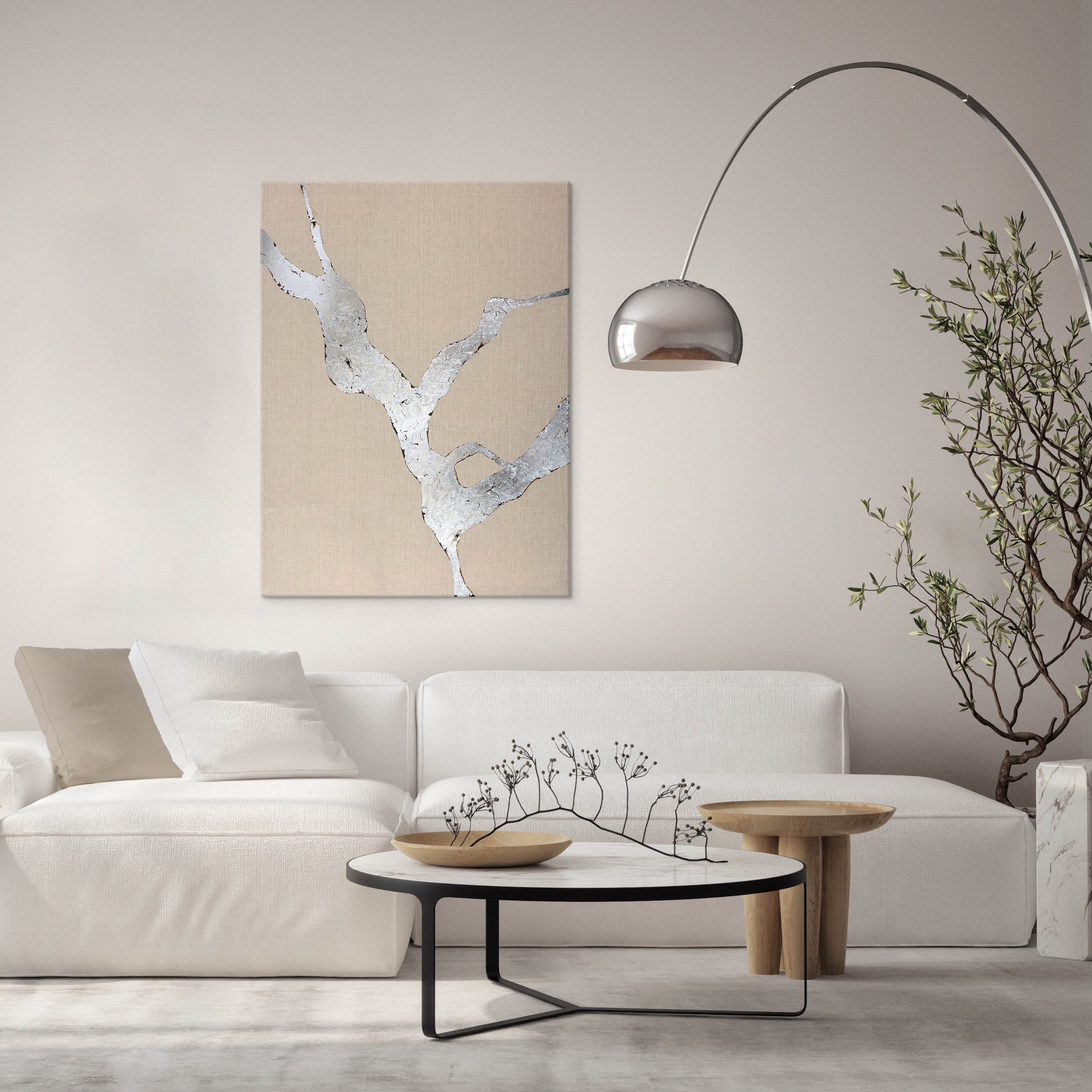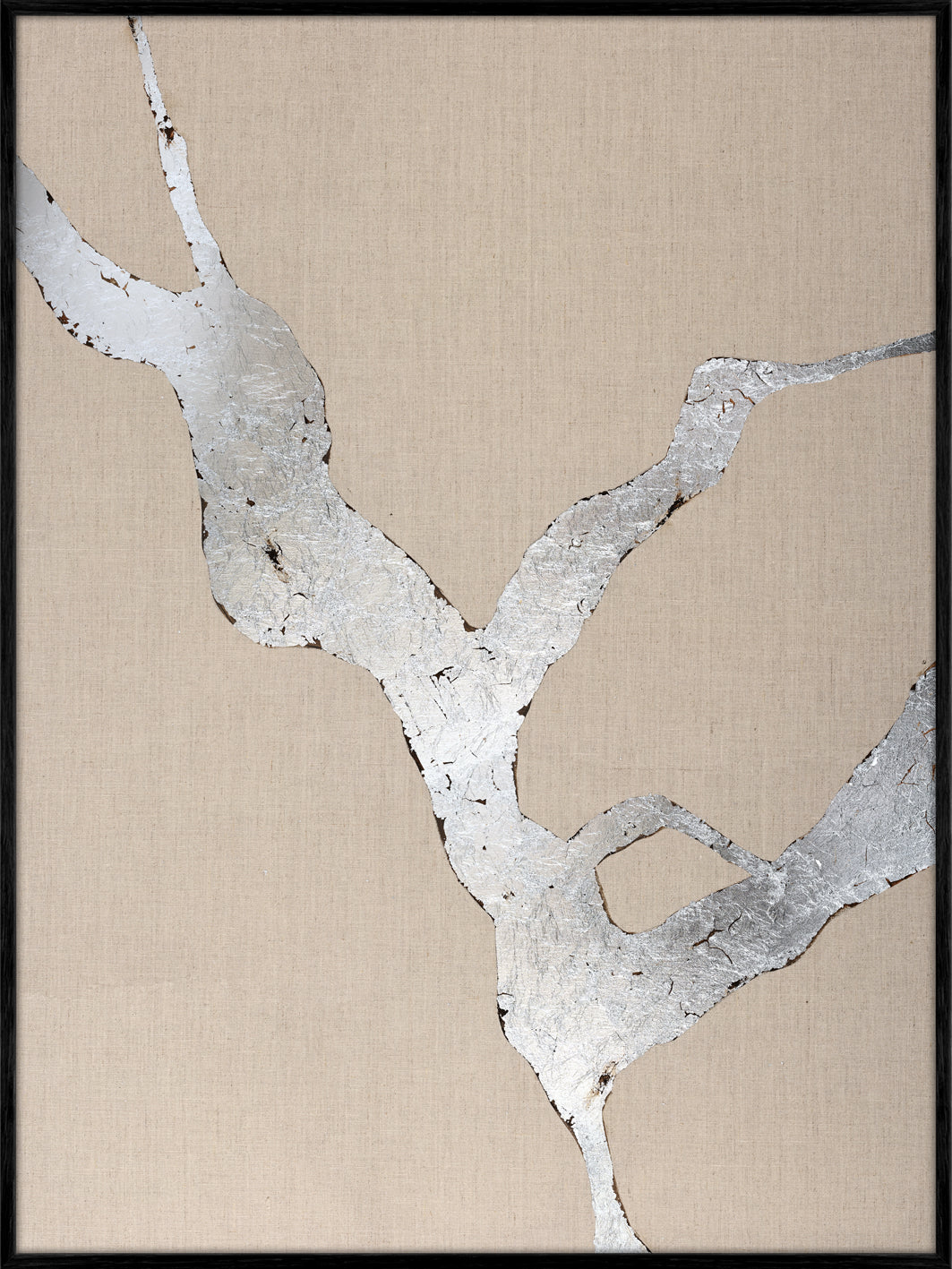 Wild Horizon Silver is a unique artwork on linen canvas, created with silver leaf that forms elegant and organic patterns. The painting combines the rawness of nature with a luxurious silver sheen.
